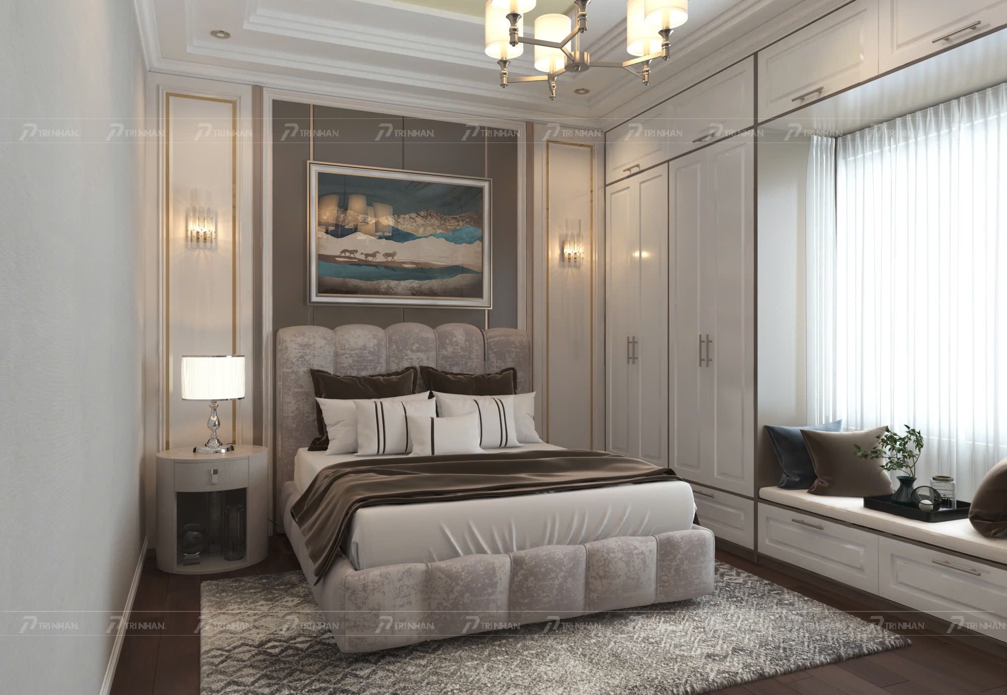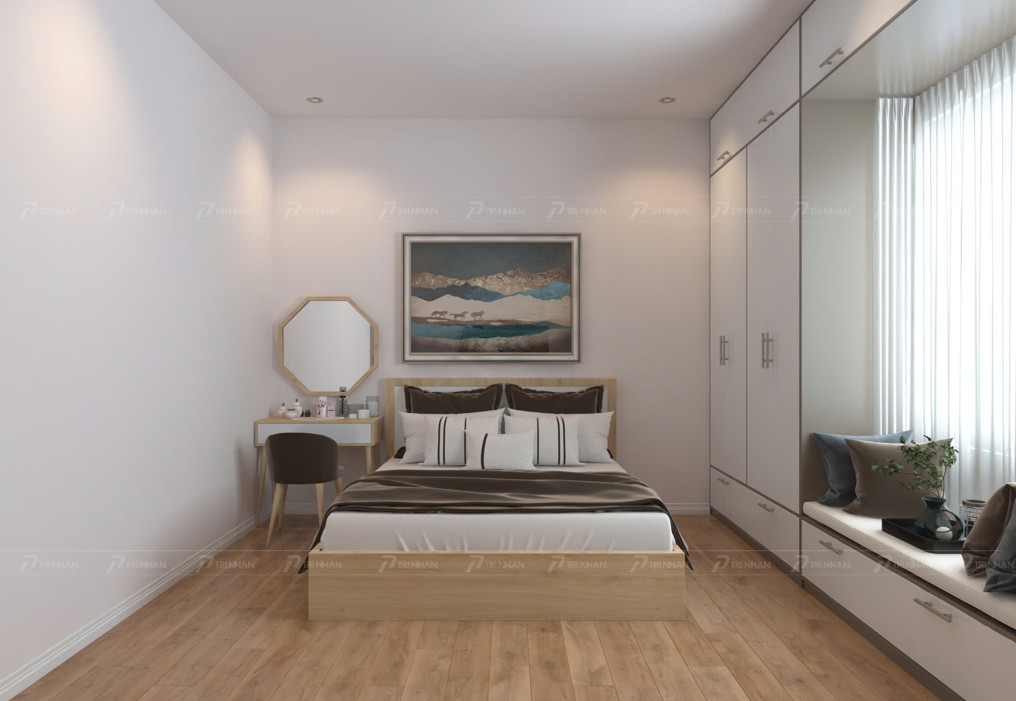 Với bức tranh phong cảnh tone màu xanh – nâu mang lại sự yên bình trong khi tủ quần áo được thiết kế âm tường cao sát trần giúp không gian trở nên gọn gàng và tối ưu lưu trữ. Bàn trang điểm nhỏ gọn kết hợp cùng ghế da nâu tạo điểm nhấn tinh tế.