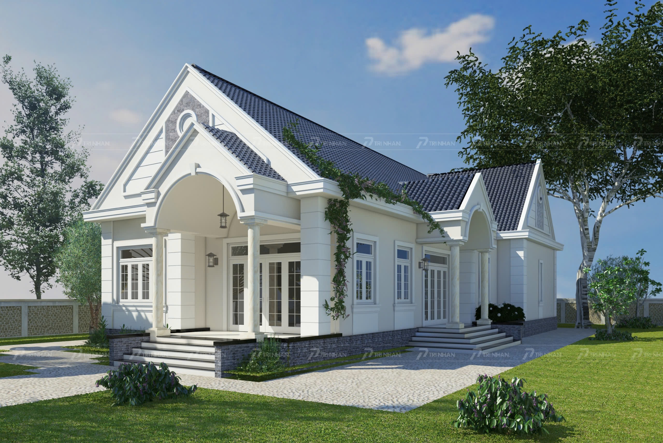 Ngôi nhà của chị Nguyệt được thiết kế theo phong cách tân cổ điển kết hợp cùng khối kiến trúc đăng đối và tỷ lệ hài hòa – yếu tố giúp công trình bền theo thời gian, Tổng thể ngôi nhà là mái Thái xanh đậm có độ dốc vừa phải giúp thoát nước nhanh phù hợp với điều kiện thời tiết miền Nam và tạo cảm giác thanh thoát, cao ráo. Mặt tiền ngôi nhà lại gây ấn tượng bởi hai cột tròn đối xứng, mái vòm cong nhẹ và phào chỉ trắng tinh tế mang lại sự mềm mại mà vẫn sang trọng.