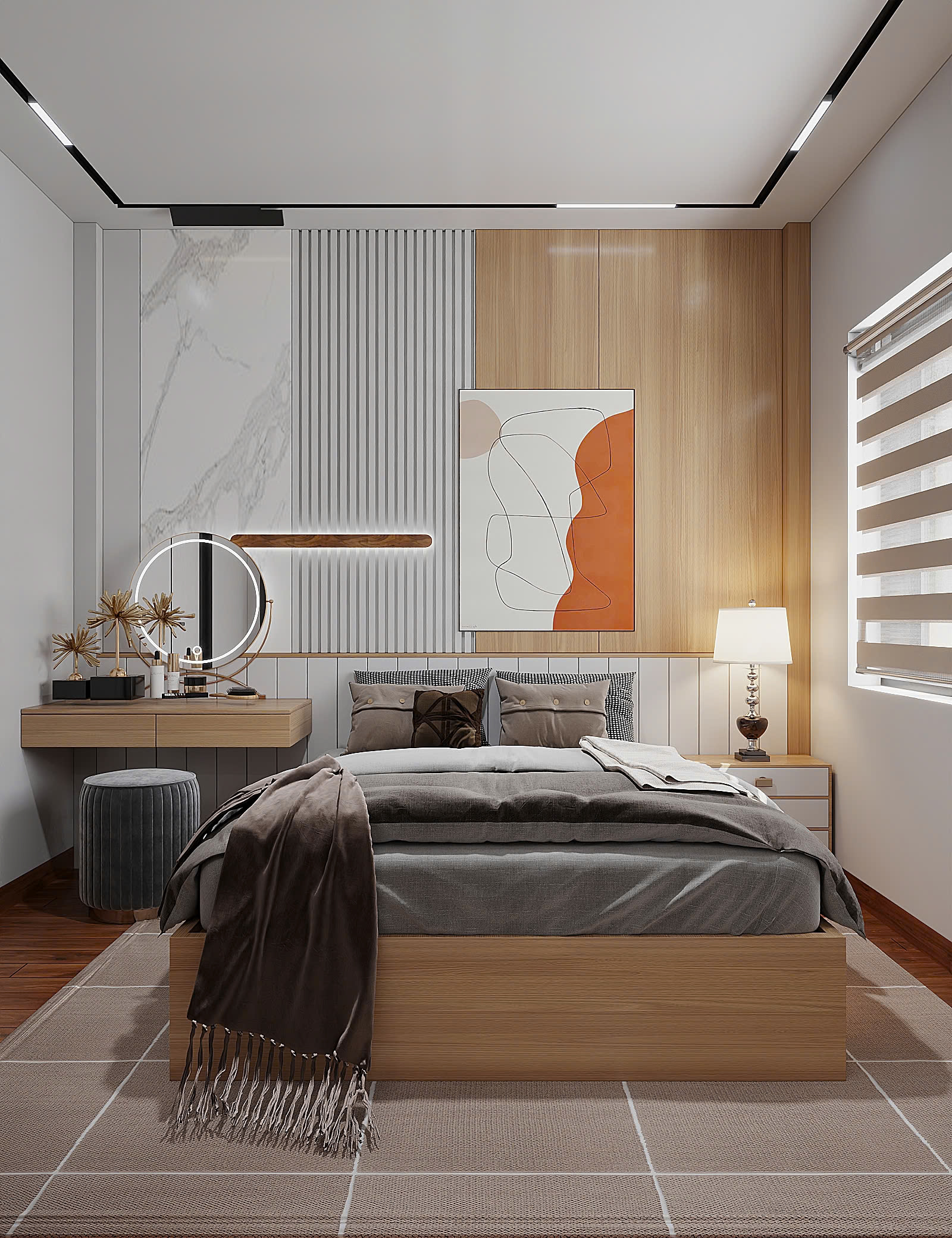 Khu vực tầng 2 là phòng ngủ master toát lên sự ấm áp với sàn gỗ màu nâu, vách đầu giường được ốp lam sóng sắng và hệ tủ quần áo kết hợp cửa kính. Với các chi tiết decor tone màu cam đất nhẹ nhàng mang lại sự tinh tế mà không phá vỡ đi cấu trúc tổng thể của công trình.